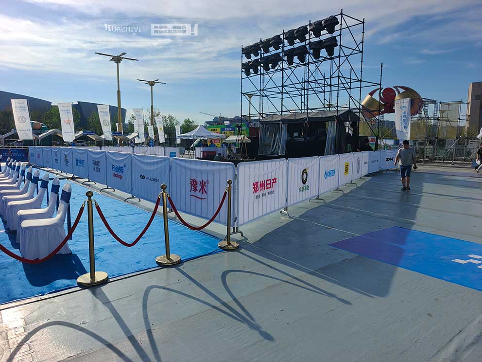 不銹鋼鐵馬護(hù)欄在場地中率先就位,它們以硬朗的身姿劃分出不同功能區(qū)域。每段 1.5 米長的鐵馬整齊排列,相互間用牢固的連接件緊密咬合,形成堅(jiān)不可摧的屏障。為契合賽事主題與宣傳需求,鐵馬護(hù)欄外包裹著白色底色的廣告布,品牌名稱以醒目的字體印于其上,在日光下清晰可見,既起到隔離防護(hù)作用,又成為流動(dòng)的廣告載體。